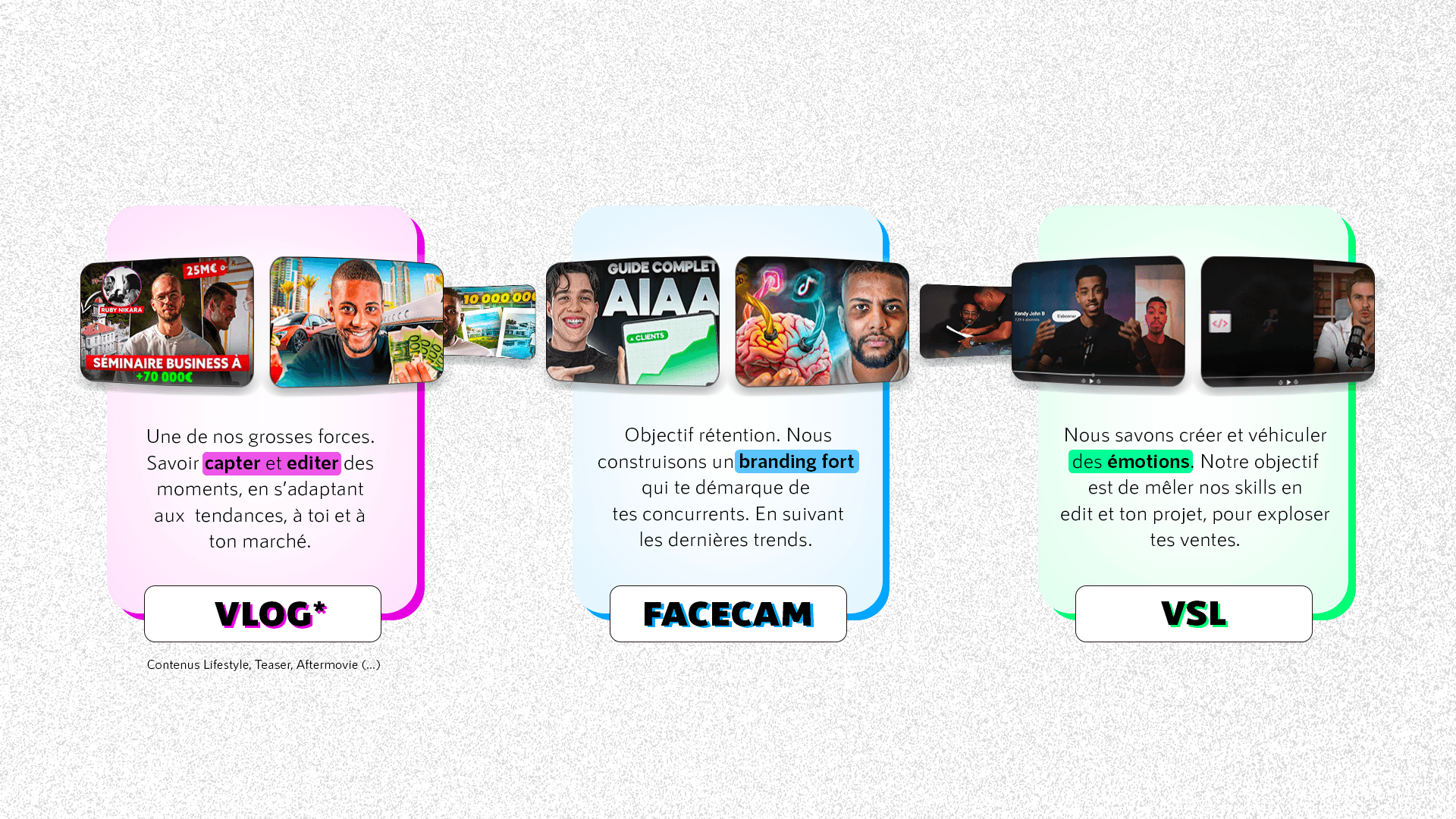 Nous souhaitons collaborer qu'avec des entrepreneurs avec une perspective à long terme et un engagement envers la qualité ambitieux qui souhaitent passer leurs vidéos au niveau supérieur.